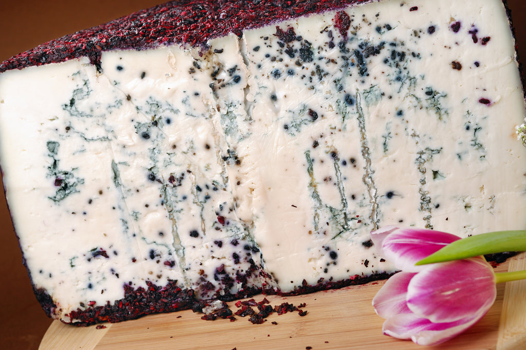 Erborinato di capra affinato con frutti di bosco e petali di rosa. Dolce, delicato e dal profumo floreale unico.