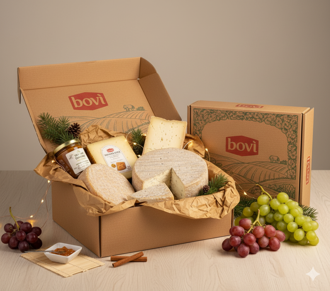 Box degustazione da 1,5 kg contenente un assortimento di 5 formaggi del caseificio Taddei e 1 mostarda artigianale a scelta per accompagnare i formaggi